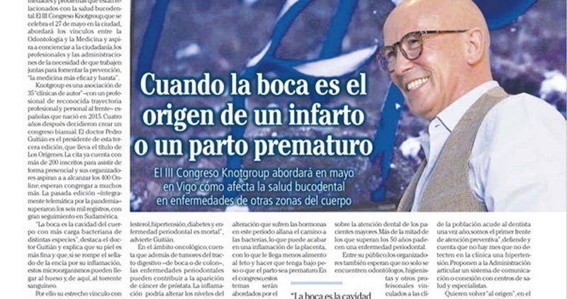 Hoy el Faro de Vigo se hace eco del III Congreso Knotgroup “Los orígenes” que tendrá lugar en Vigo el próximo 27 de mayo y entrevista al Dr. Pedro Guitián, su presidente, para conocer de cerca las temáticas que se abordarán en el congreso que une medicina y odontología, inteligencia artificial, tecnología y digitalización. El Dr. Pedro Guitián participará también en una mesa redonda y la Dra. Elena López Alvar, parte del comité organizador y científico del evento nos hablará de la gestión de las emociones en consulta y la atención centrada en el paciente. Vigo se convertirá así el 27 de mayo en la capital de la odontología Vigo en la capital de la odontología, en la que se darán cita prestigiosos científicos e investigadores como el conocido Dr. Ángel Carracedo o el Dr. Pedro Diz.
