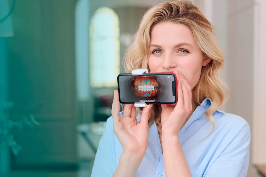 Una vez que comiences el tratamiento, te proporcionaremos el dispositivo necesario para capturar imágenes de tus dientes con tu móvil. Estas imágenes se envían a través de la aplicación Dental Monitoring®, y nosotros nos encargamos de revisar tu progreso regularmente, ajustando el plan si es necesario.